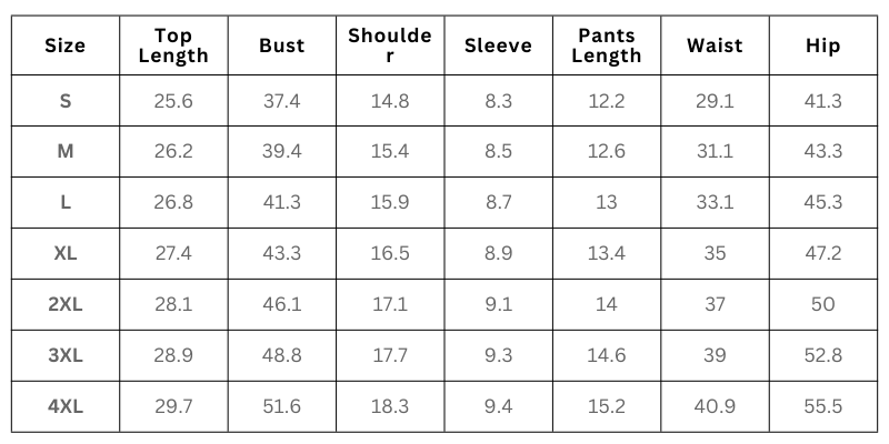 Short Set Size Chart (Inches):