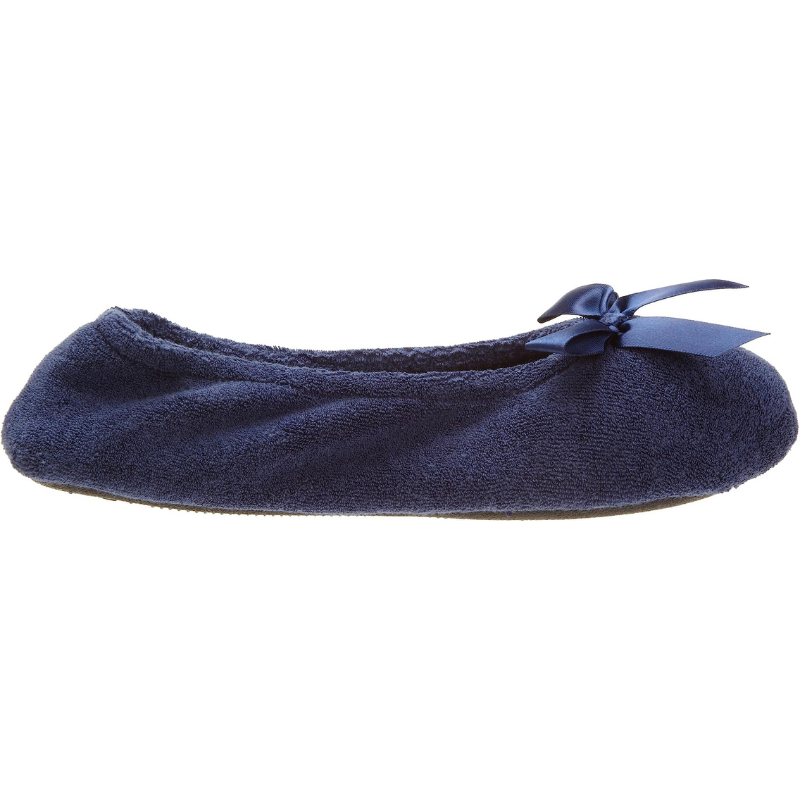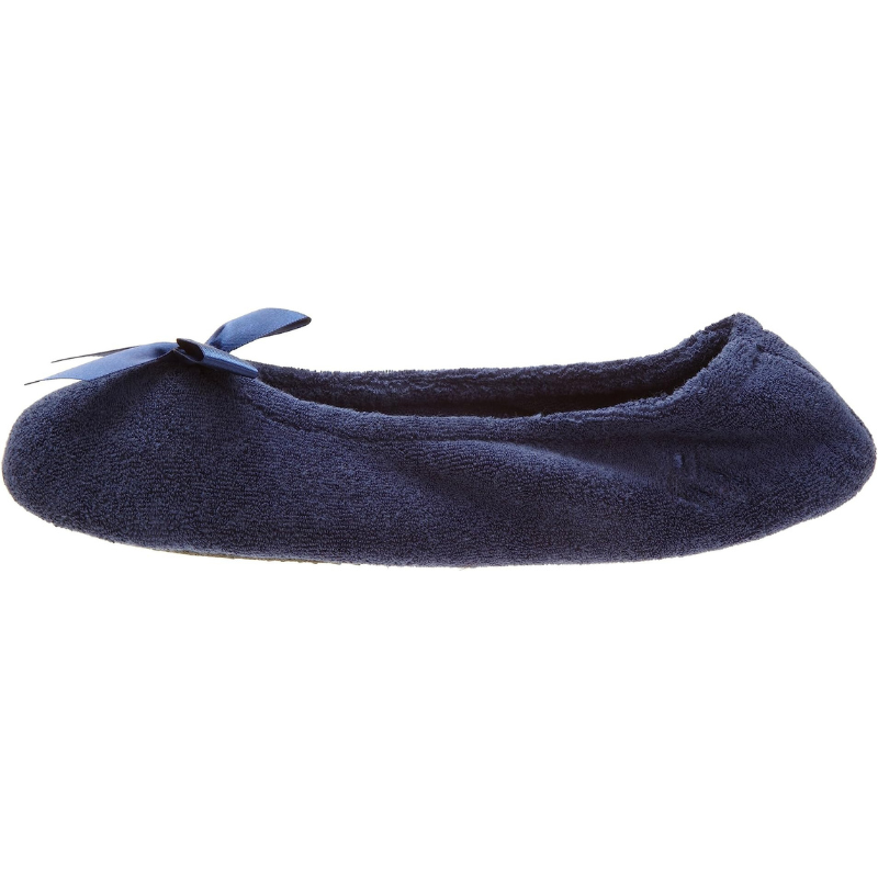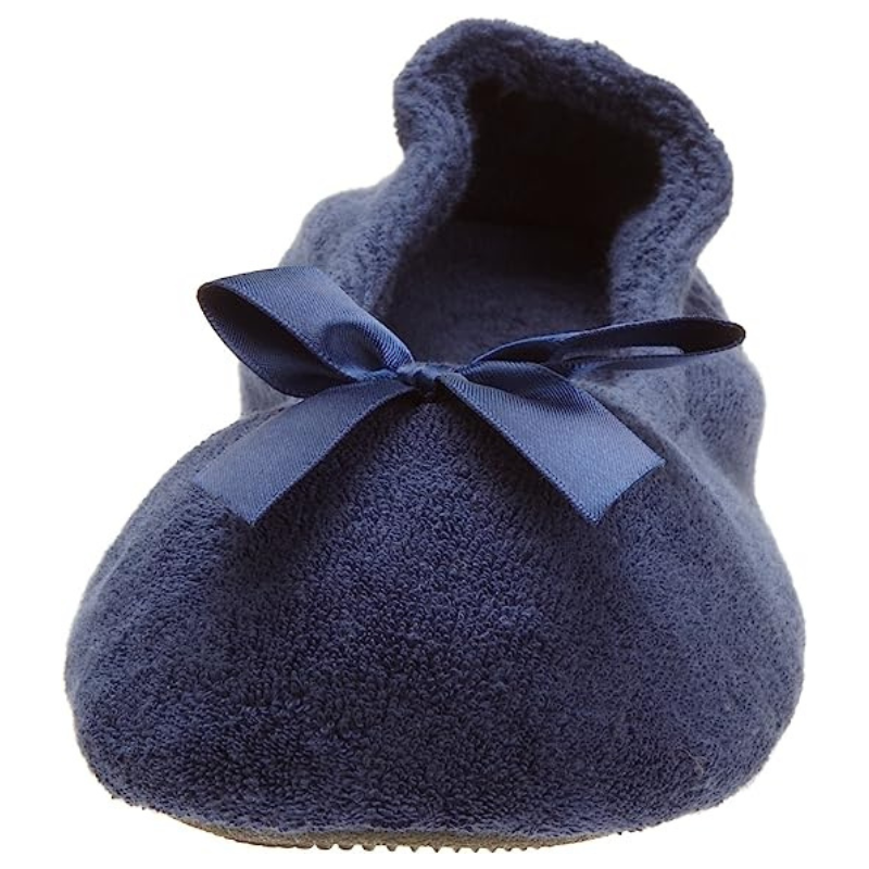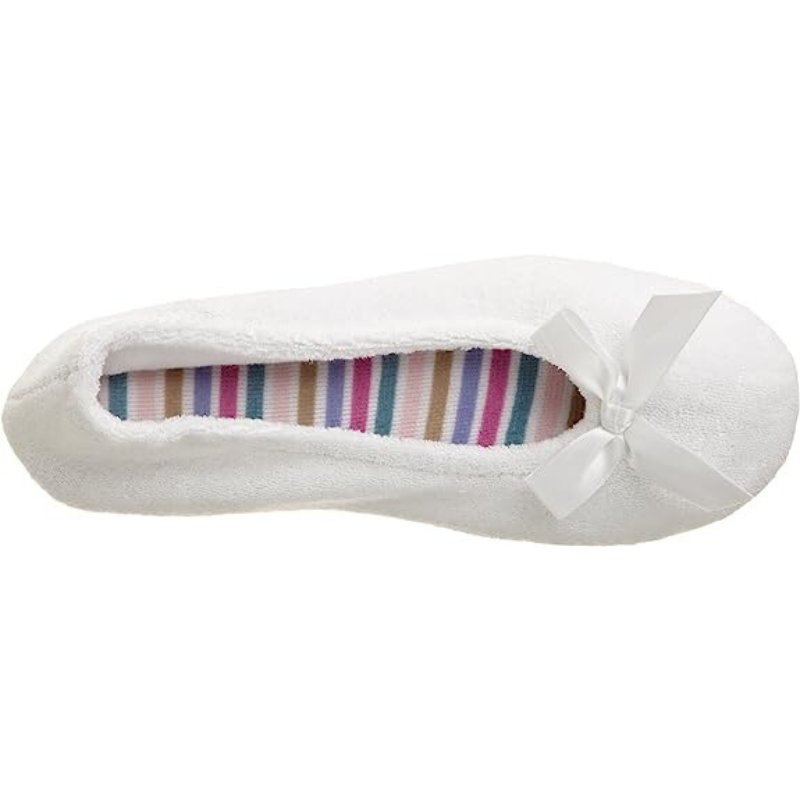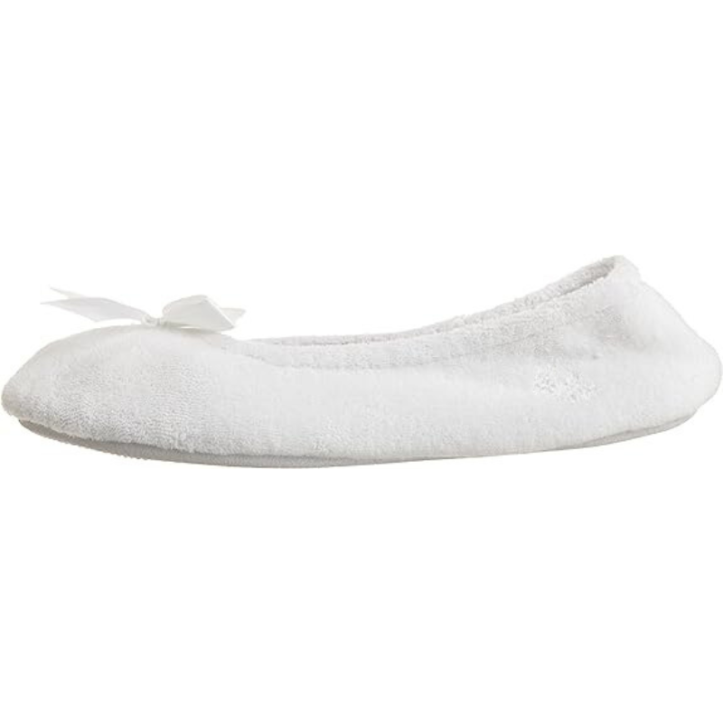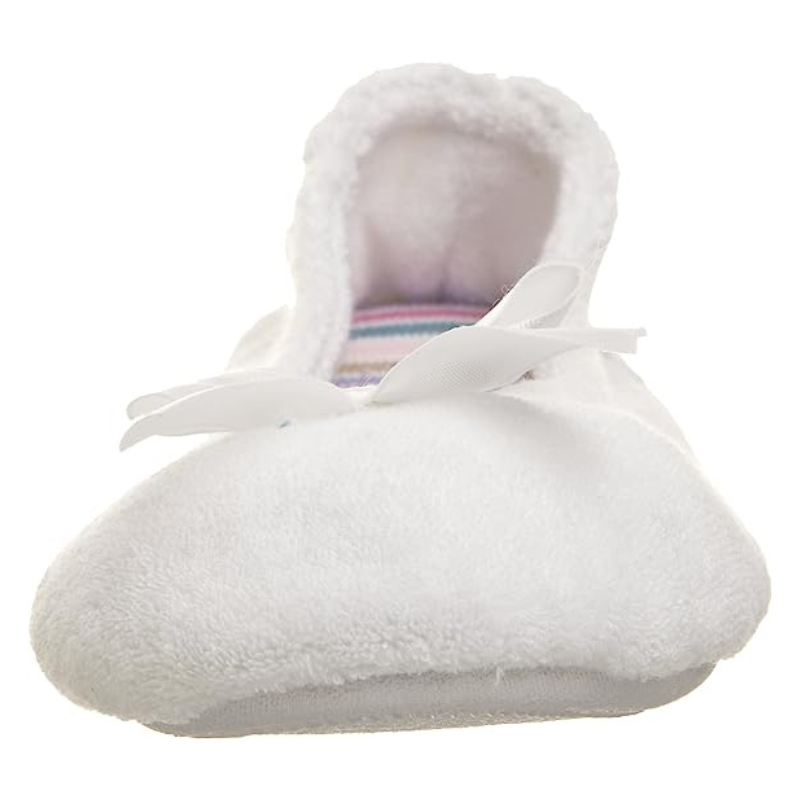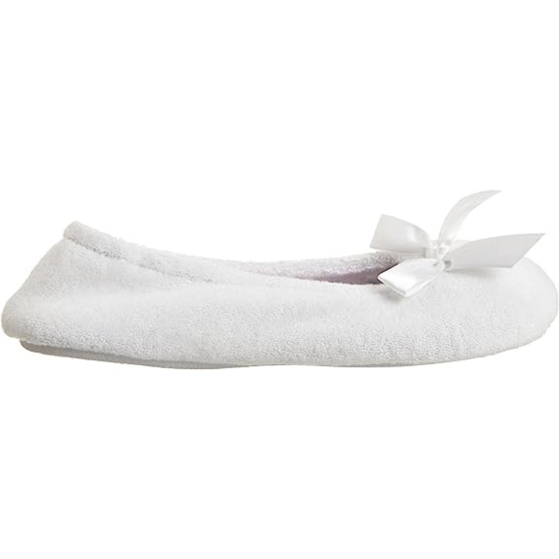 • Supremely soft Slipper: Cotton-blend plush terry ballerina house shoes for warm and cozy comfort; easy to wear flexible fit with satin bow detail for timeless style.