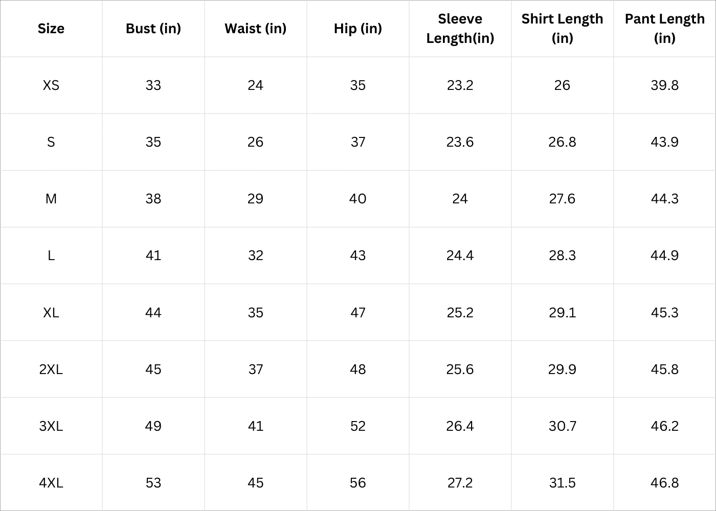 Adult Size Chart (Inches):