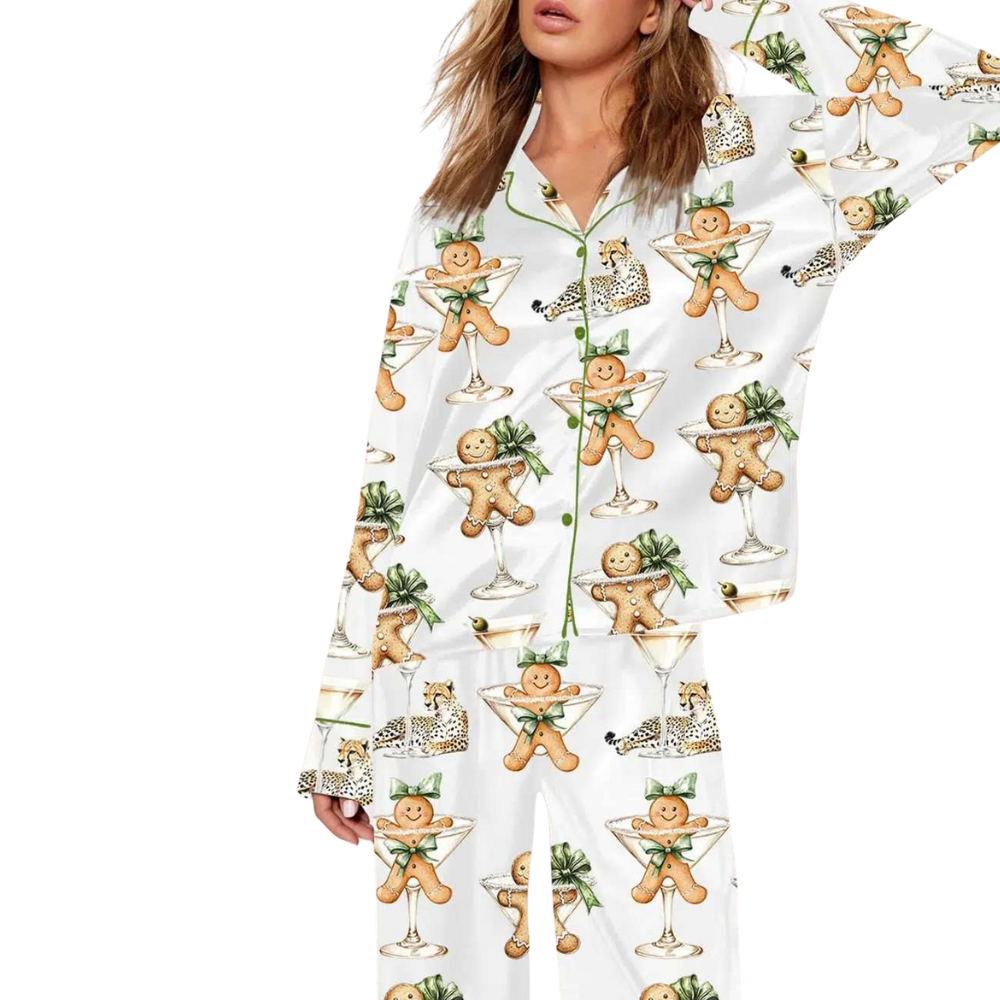 This pajama set showcases gingerbread figures styled with ribbons and cheerful expressions. These illustrations reference classic holiday baking traditions. Gingerbread imagery has remained a symbol of celebration across generations.