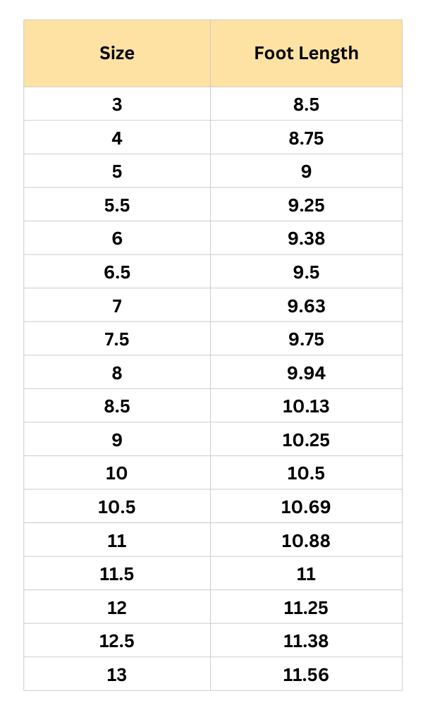 Size Guide (inches) :