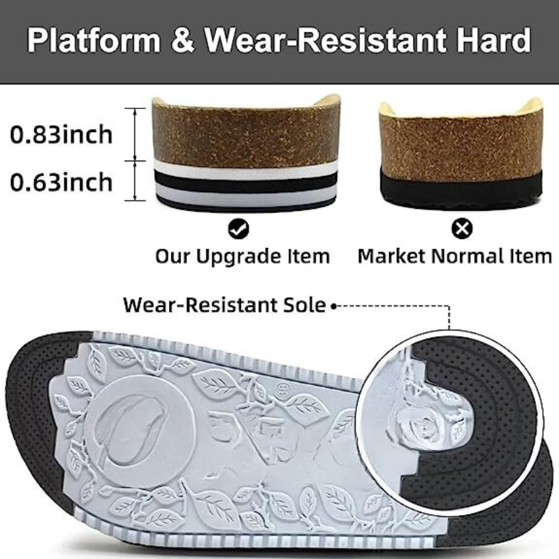 • Arch support padding - platform tread consists of the rubber outsole and cork midsole & insole. Flatform soft sole is supportive, with ergonomic support and heel cup design providing a lightweight comfortable walk.