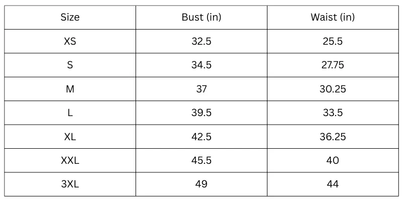Size Chart: (Inches)
