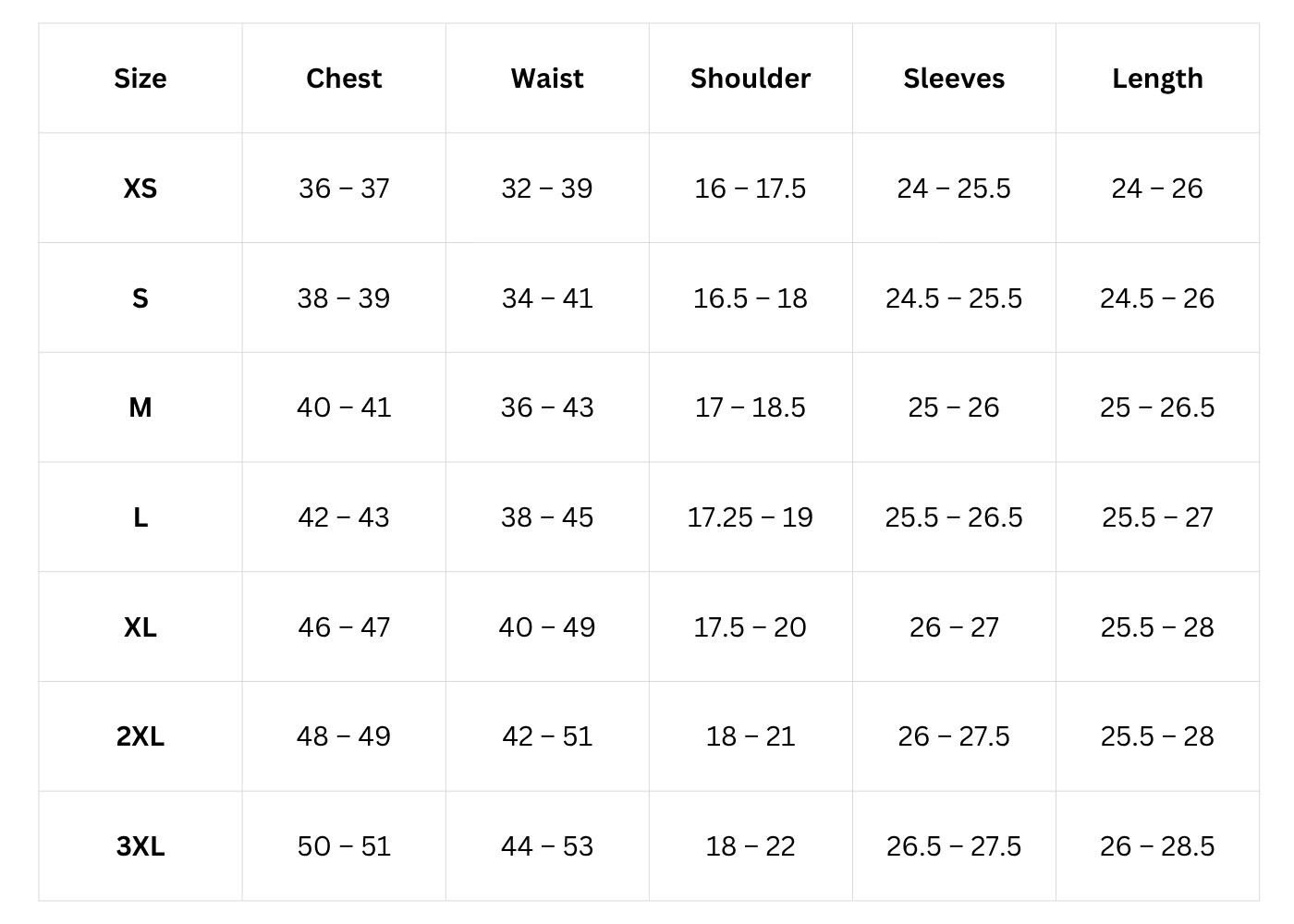 Size Chart (inches):
